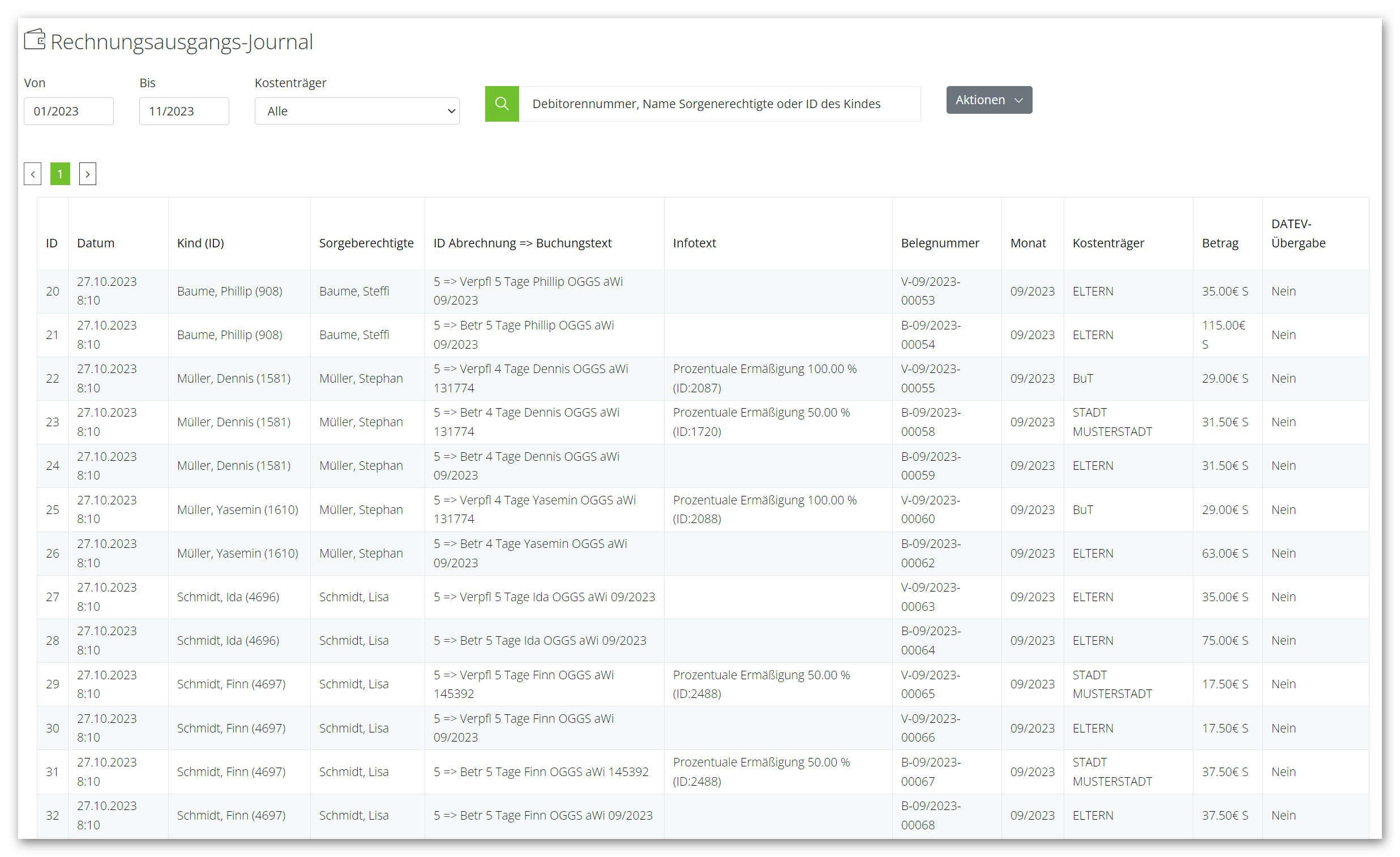 Die Abrechnung der Betreuungskosten und Ferienbetreuungen erfolgt vollständig über GTSPro, das Buchungssätze auch an Finanzbuchhaltungssysteme wie z.B. die DATEV übergeben kann. Ein Rechnungsausgangsjournal hilft Ihnen dabei, stets den Überblick zu behalten. Selbstverständlich können auch alle Kostenträger mit GTSPro abgerechnet werden.
