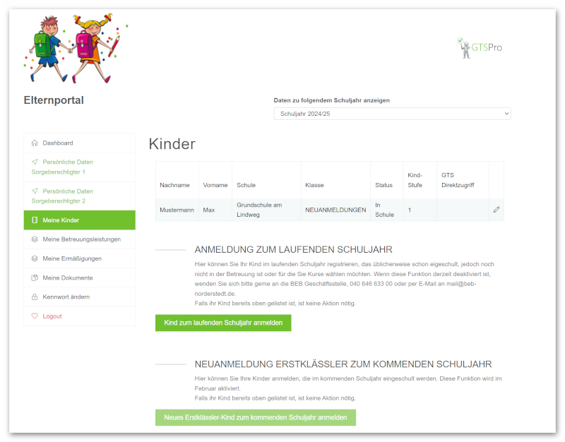 Eltern haben über ein Elternportal von GTSPro Zugriff auf ihre Stammdaten. Dort werden den Eltern auch Kostenbescheide, Kurszusagen, SEPA-Mandatsdokumente und Benachrichtigungen über auslaufende Ermäßigungen zur Verfügung gestellt. Natürlich können über das Elternportal auch Betreuungsprodukte bestellt, Änderungsanträge gestellt oder Kündigungen ausgesprochen werden.