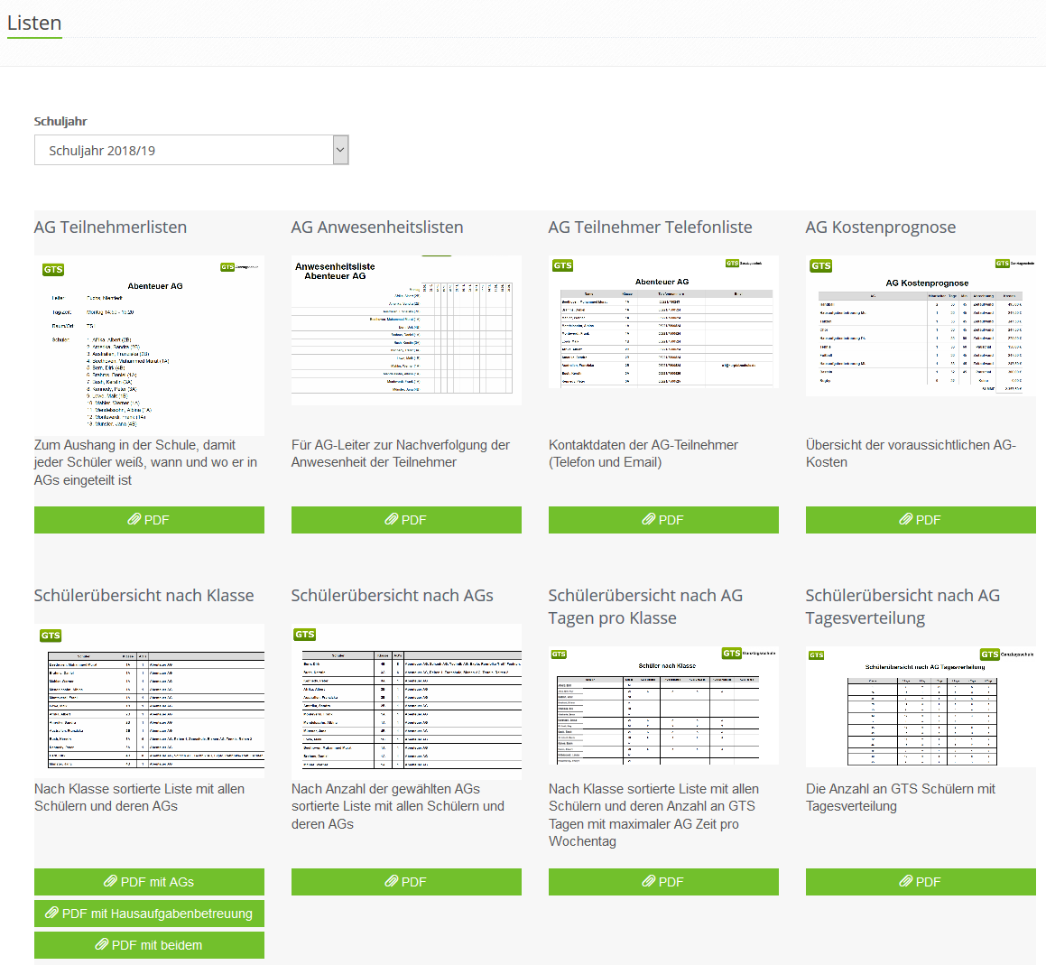 Die GTS-Verwaltungssoftware bietet Ihnen über 40 verschiedene Listen zum Ausdruck. AG Teilnehmerlisten, Auflisten der AGs pro Klassenschüler, Raumbelegungspläne, AG Kostenprognosen und viele mehr. Ihre Wunschliste ist nicht dabei? Kein Problem. Wir stellen Ihnen die Liste innerhalb von 24h zur Verfügung.