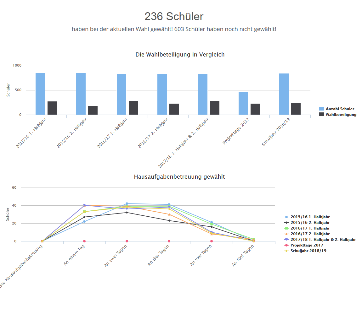 Während des Wahlzeitraumes kann der Ganztagsverantwortliche in Echtzeit die Verteilung der Schüler auf die unterschiedlichen AGs einsehen. Auch eine Gesamtstatistik ist abrufbar.
